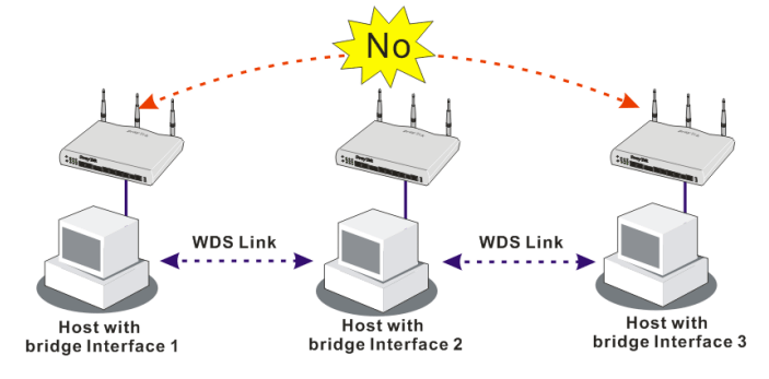 Bridge WDS : Bir WDS bridge cihazı kendisinden sonra bir tekrarlama işlemi yapamaz. Bu durumda birden fazla bağlantıyı karşılasa da bunları tek bir merkez nokta da toplayabilir.  Bu nedenle üç wire bağlantının birleştireceği durumlarda her bir bridge cihaz bir diğer cihazla da bağlantı haline getirilmelidir.